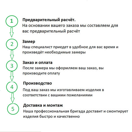 1. Предварительный расчет. 2. Замер. 3. Заказ и оплата. 4. Производство. 5.Доставка и монтаж.