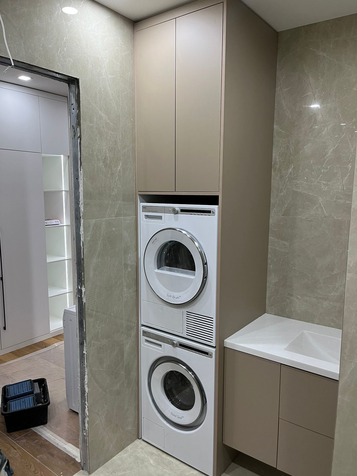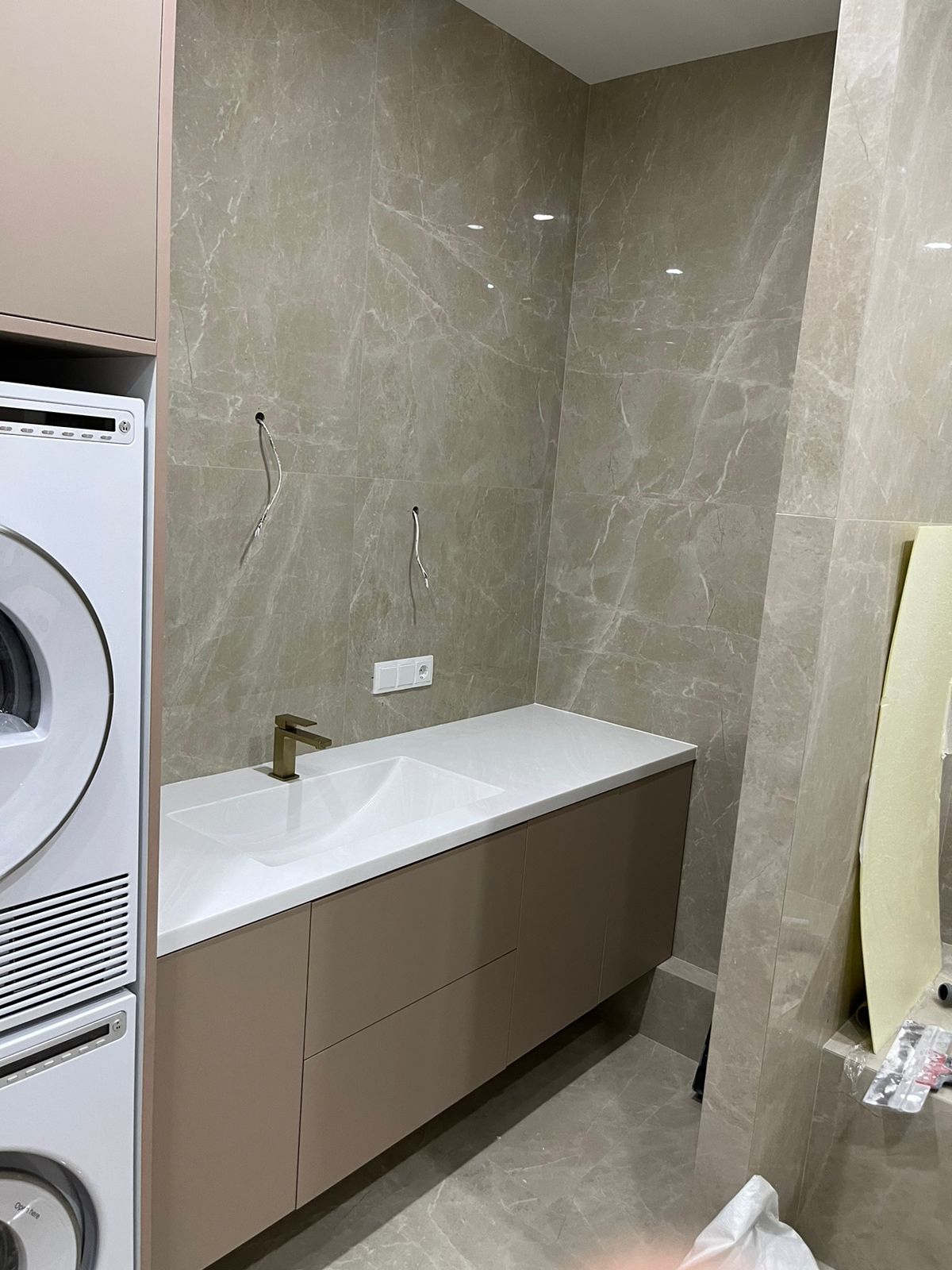 Тумба подвесная с интегрированной раковиной и открытой полкой внизу. Распашные дверки над инсталляцией. Шкаф-пенал для стиральной и сушильной машины в колонну. Вы можете выбрать наполнение мебели, размер, конструктив. Ручки (накладные, скрытые, без ручек - система открывания Tip-On). Количество ящиков - от 1 шт . Фурнитура - Boyard, Blum, Hettich. Мы изготовим необходимую Вам мебель по индивидуальному размеру и дизайну, с любым функционалом. Более 9000 цветовых решений по RAL или NCS палитре. Широкий выбор материалов - МДФ в эмали, МДФ в плёнке, AGT, EGGER, SMART, CLEAF. Выбор фурнитуры от средних до премиальных брендов. Для получения консультации Вы можете: - написать на электронную почту: ldstudio25@bk.ru позвонить нам :+7 (905) 528-42-50