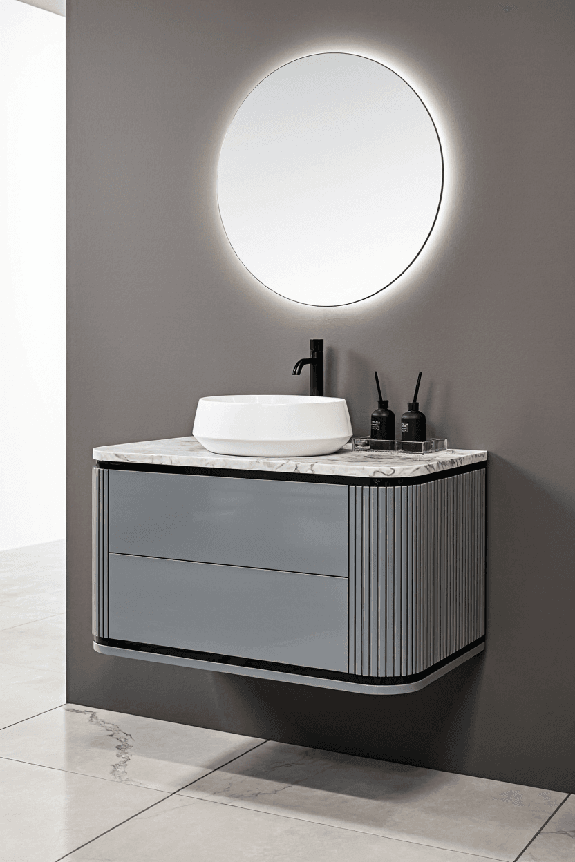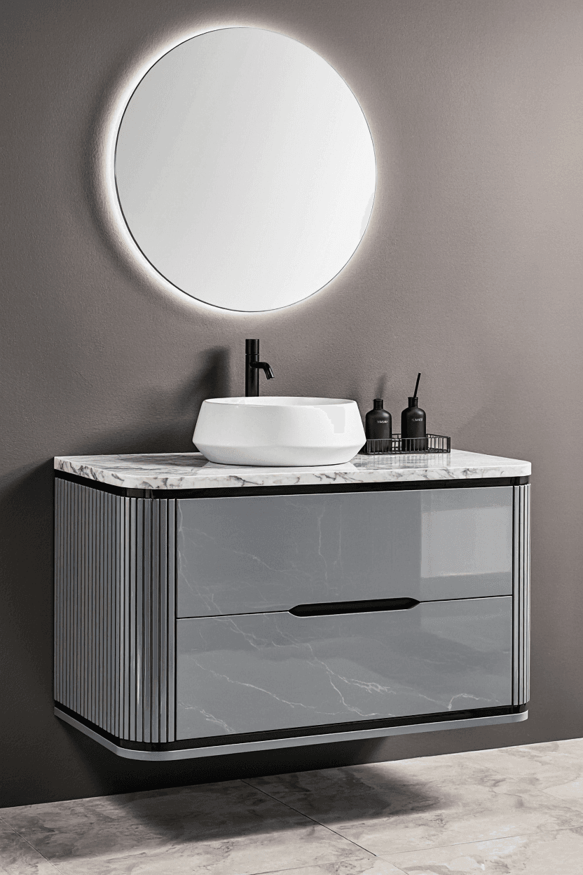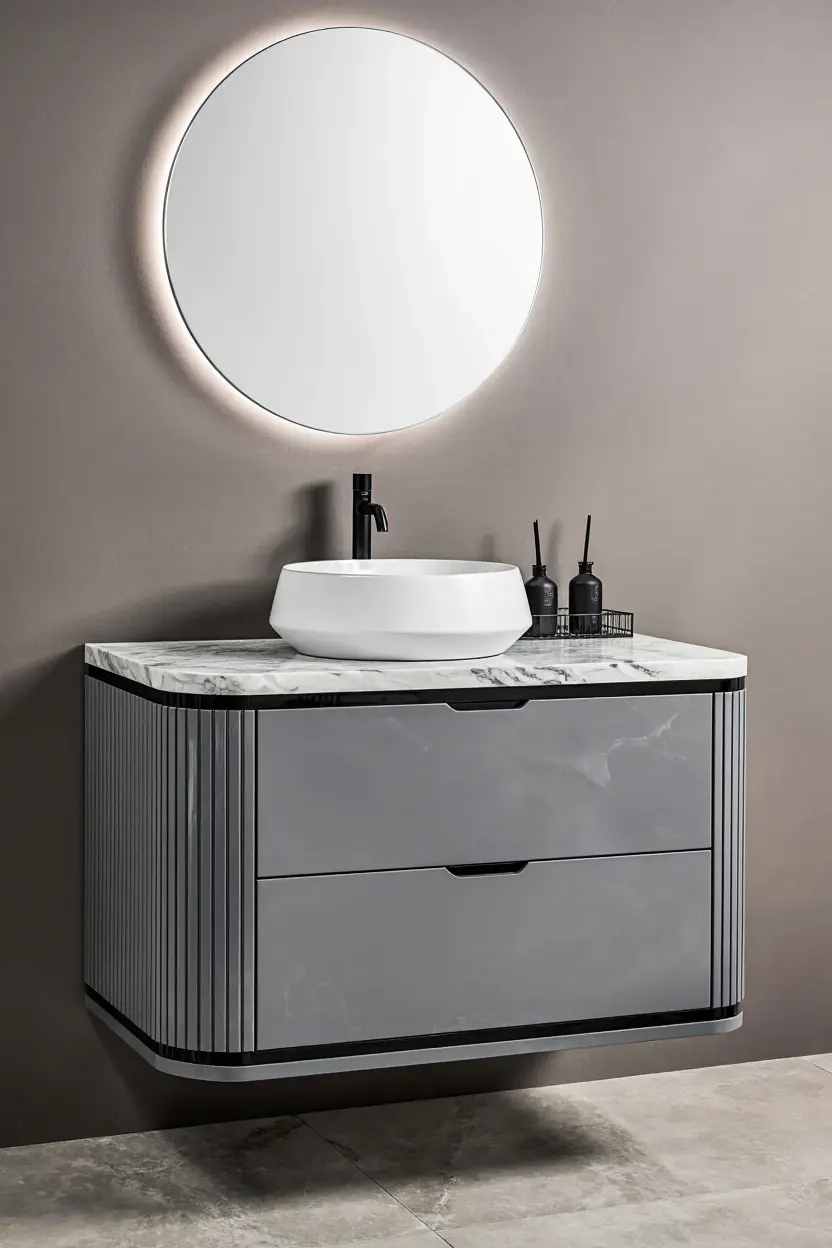 Что входит в комплект: - Подвесной шкаф с двумя выдвижными ящиками - Мраморная столешница (или имитация мрамора) - Керамическая раковина-чаша белого цвета - Смеситель черного матового цвета - Круглое зеркало с LED-подсветкой Особенности: - *Модный дизайн*: гладкие поверхности, вертикальные рельефные панели и чёткие линии создают эффект ар-деко в современной интерпретации. - *Функциональность*: два вместительных ящика обеспечивают удобное хранение косметики, полотенец и аксессуаров. - *Подсветка зеркала*: мягкий свет по периметру зеркала обеспечивает отличное освещение без теней — идеально для утреннего макияжа и ухода за собой. - *Подвесная конструкция*: экономит пространство, легко чистится и визуально «воздушно» вписывается в интерьер. - *Универсальные материалы*: прочная фасадная панель, водостойкая столешница, качественная керамика и долговечная фурнитура. Почему выбирают Cтрата"? - Подходит для ванных комнат в стиле *минимализм, лофт, скандинавский или ар-деко*. - Идеальный выбор для *маленьких и средних помещений* — создаёт ощущение простора. - Высокое качество сборки и материалов — гарантия долговечности. Для кого: - Для тех, кто ценит *стиль и функциональность*. - Для любителей *современного дизайна с акцентом на свет и текстуры*. - Для владельцев квартир и домов, стремящихся к *комфорту и эстетике* каждый день. Доступен в наличии. Доставка по всей стране. Установка по желанию. 👉 *Выберите свой вариант — и превратите ванную в место для отдыха и красоты.* Для получения консультации Вы можете: - написать на электронную почту: ldstudio25@bk.ru позвонить нам :+7 (905) 528-42-50