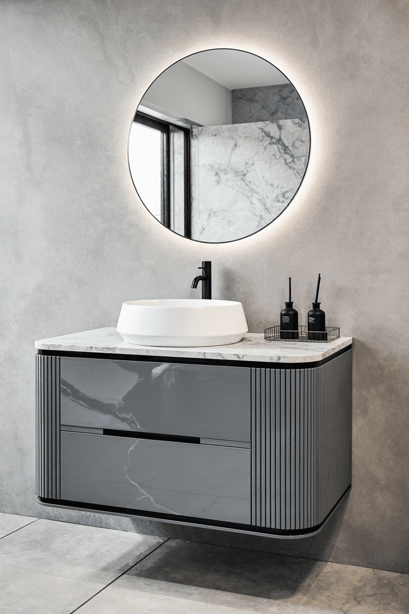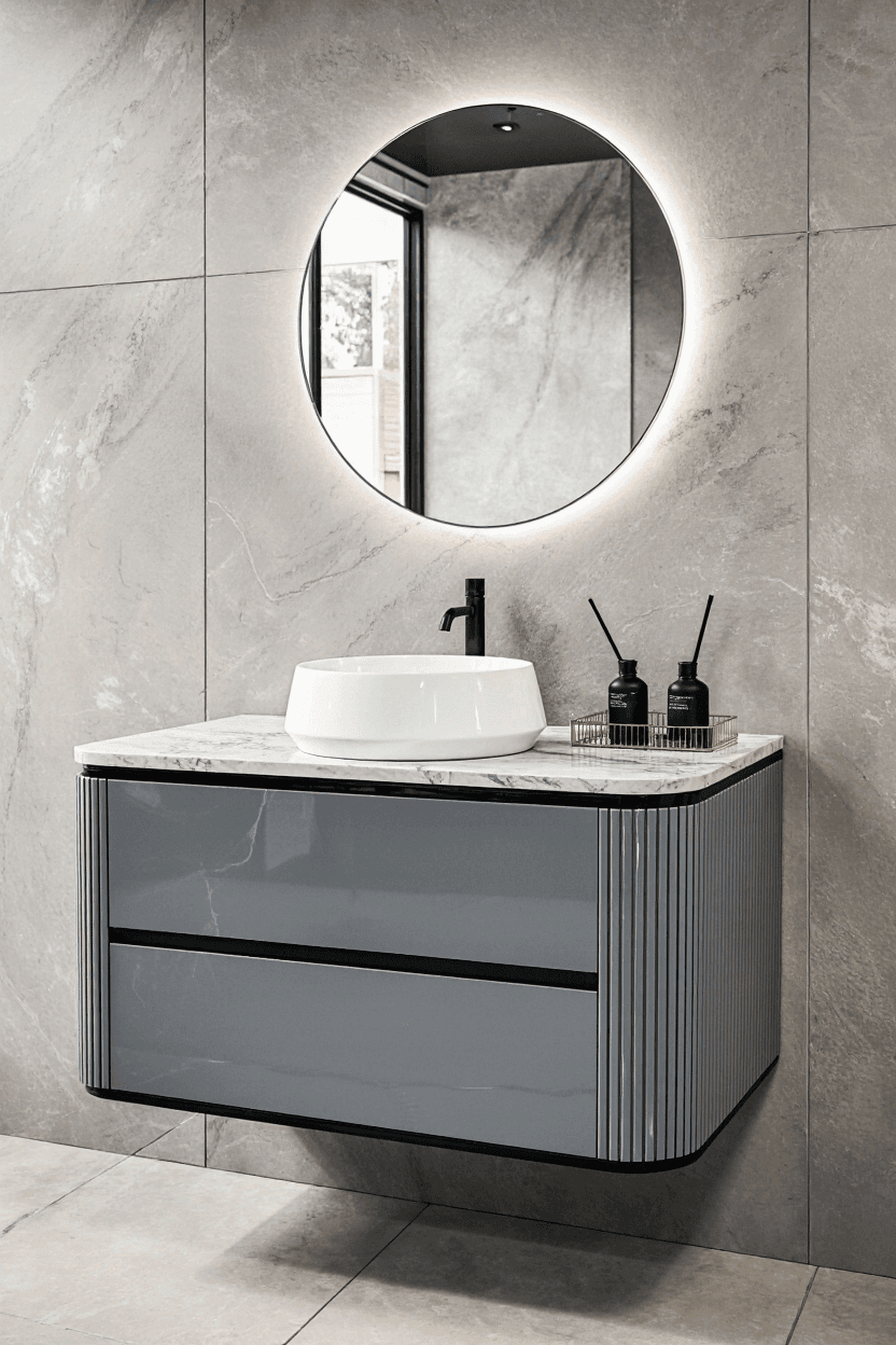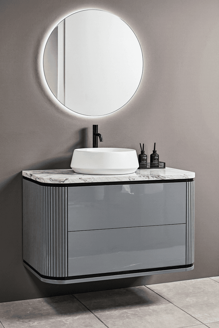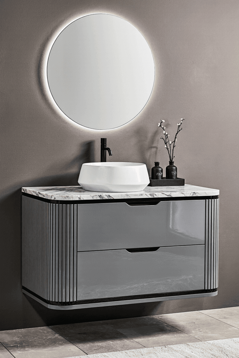 Что входит в комплект: - Подвесной шкаф с двумя выдвижными ящиками - Мраморная столешница (или имитация мрамора) - Керамическая раковина-чаша белого цвета - Смеситель черного матового цвета - Круглое зеркало с LED-подсветкой Особенности: - *Модный дизайн*: гладкие поверхности, вертикальные рельефные панели и чёткие линии создают эффект ар-деко в современной интерпретации. - *Функциональность*: два вместительных ящика обеспечивают удобное хранение косметики, полотенец и аксессуаров. - *Подсветка зеркала*: мягкий свет по периметру зеркала обеспечивает отличное освещение без теней — идеально для утреннего макияжа и ухода за собой. - *Подвесная конструкция*: экономит пространство, легко чистится и визуально «воздушно» вписывается в интерьер. - *Универсальные материалы*: прочная фасадная панель, водостойкая столешница, качественная керамика и долговечная фурнитура. Почему выбирают Cтрата"? - Подходит для ванных комнат в стиле *минимализм, лофт, скандинавский или ар-деко*. - Идеальный выбор для *маленьких и средних помещений* — создаёт ощущение простора. - Высокое качество сборки и материалов — гарантия долговечности. Для кого: - Для тех, кто ценит *стиль и функциональность*. - Для любителей *современного дизайна с акцентом на свет и текстуры*. - Для владельцев квартир и домов, стремящихся к *комфорту и эстетике* каждый день. Доступен в наличии. Доставка по всей стране. Установка по желанию. 👉 *Выберите свой вариант — и превратите ванную в место для отдыха и красоты.* Для получения консультации Вы можете: - написать на электронную почту: ldstudio25@bk.ru позвонить нам :+7 (905) 528-42-50