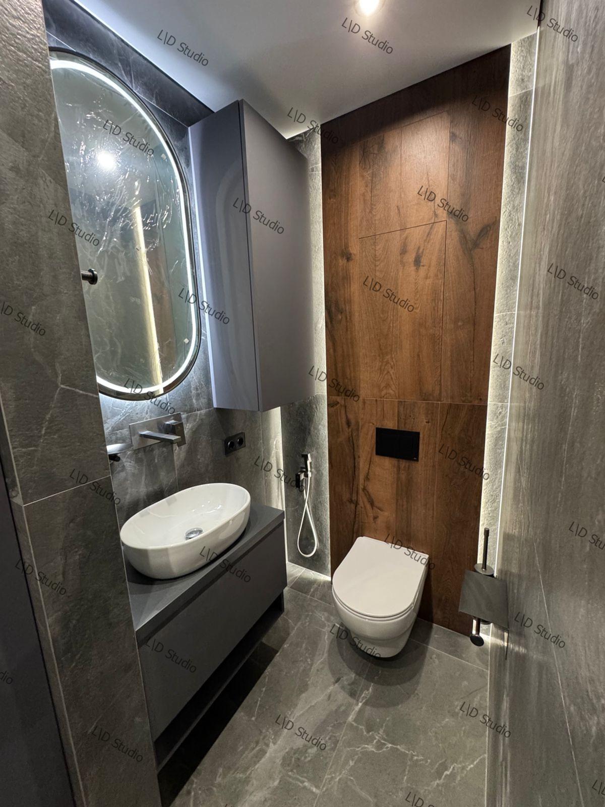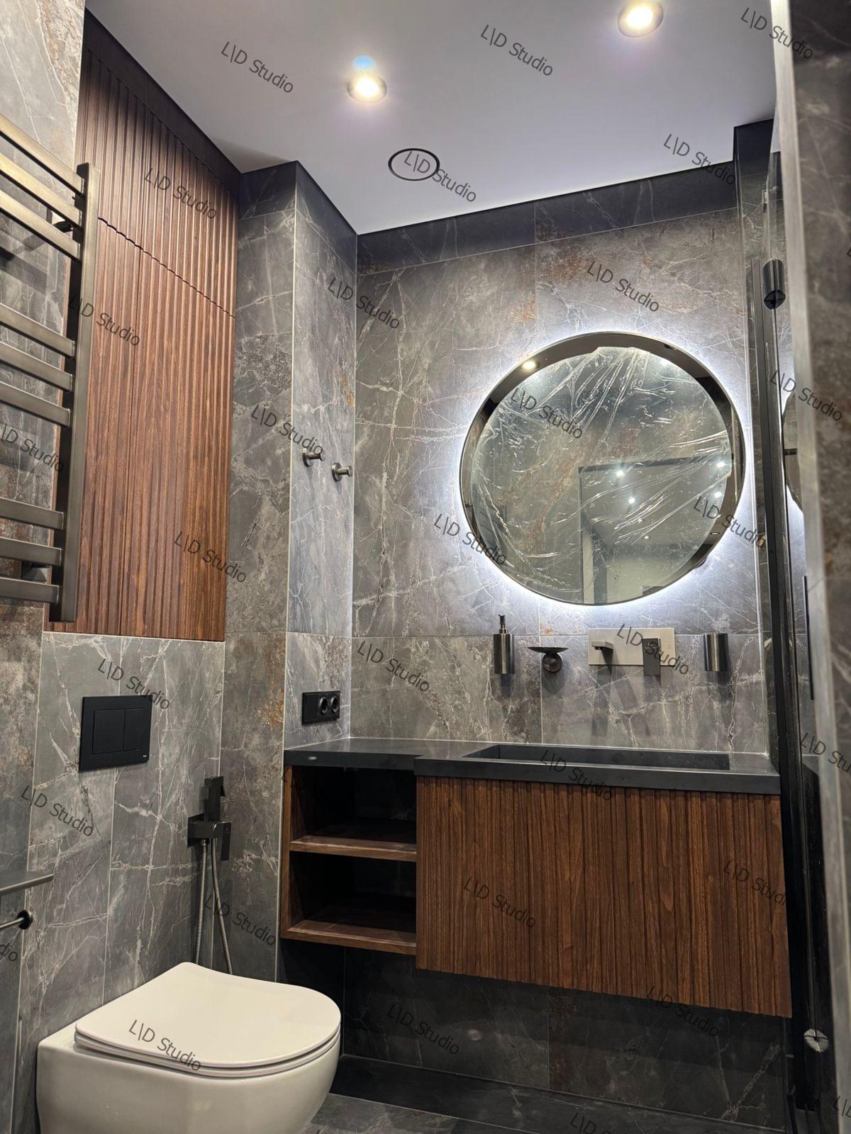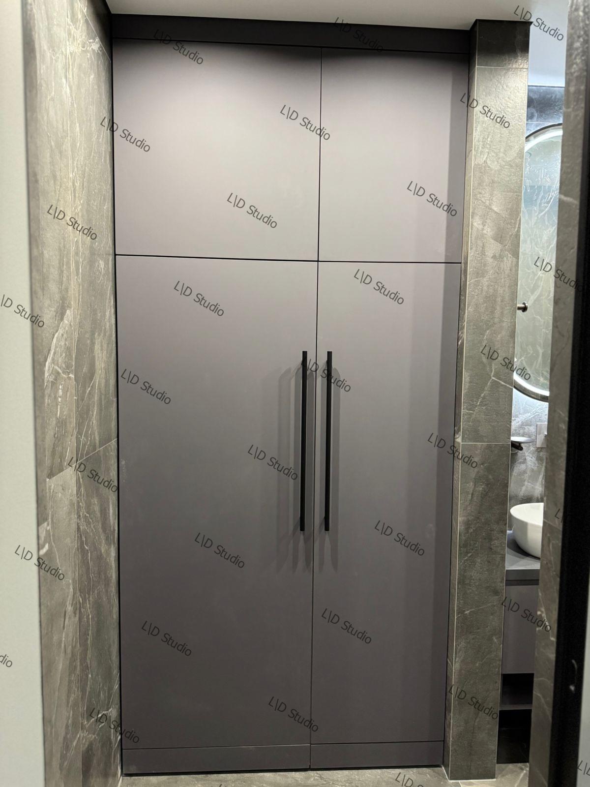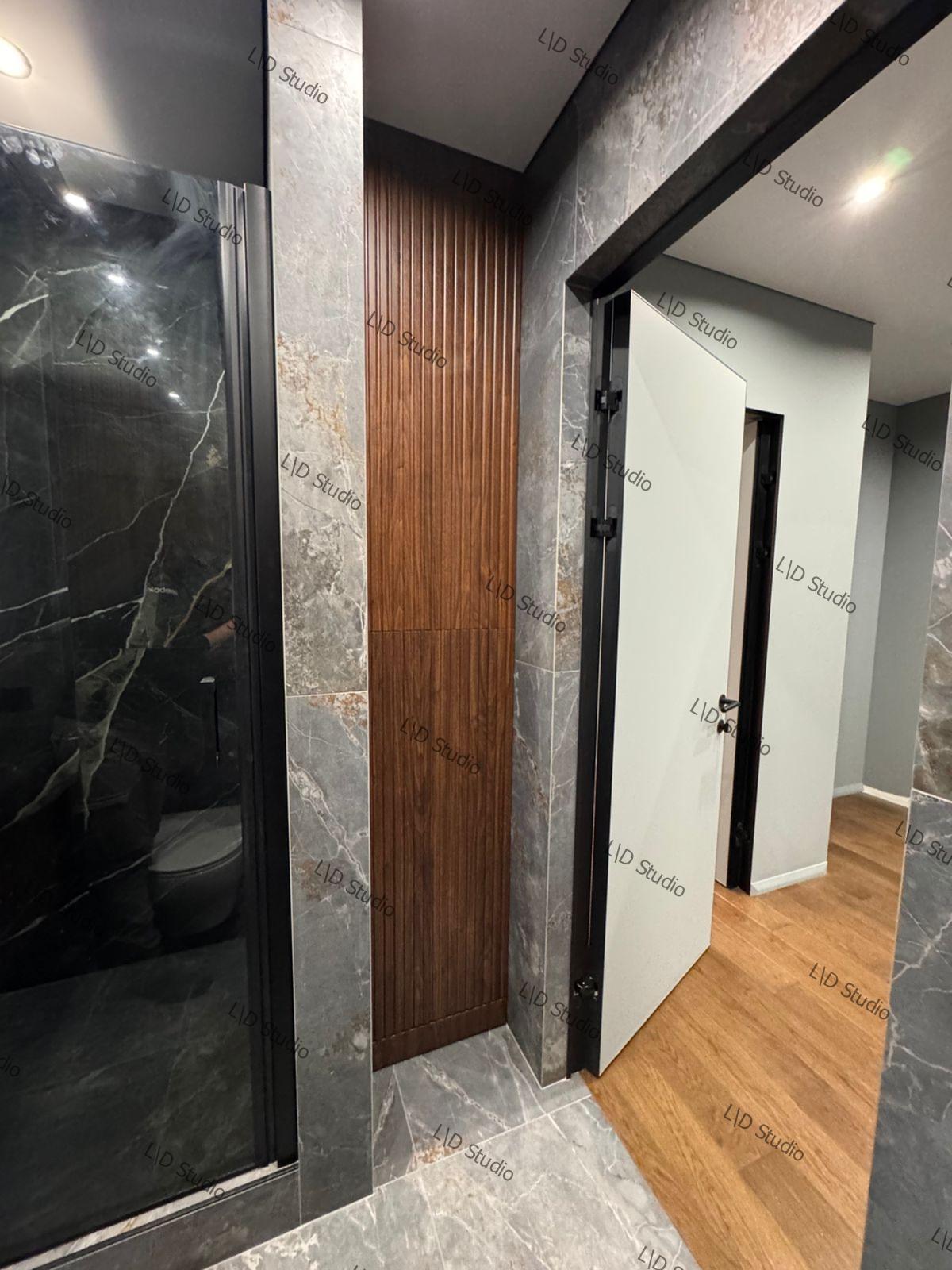 Изготовление мебели для ванной комнаты по индивидуальным размерам и параметрам. Реализованный проект, выполнен в материале: МДФ , пвх плёнка. Фасад реечный\механизм Blum.
