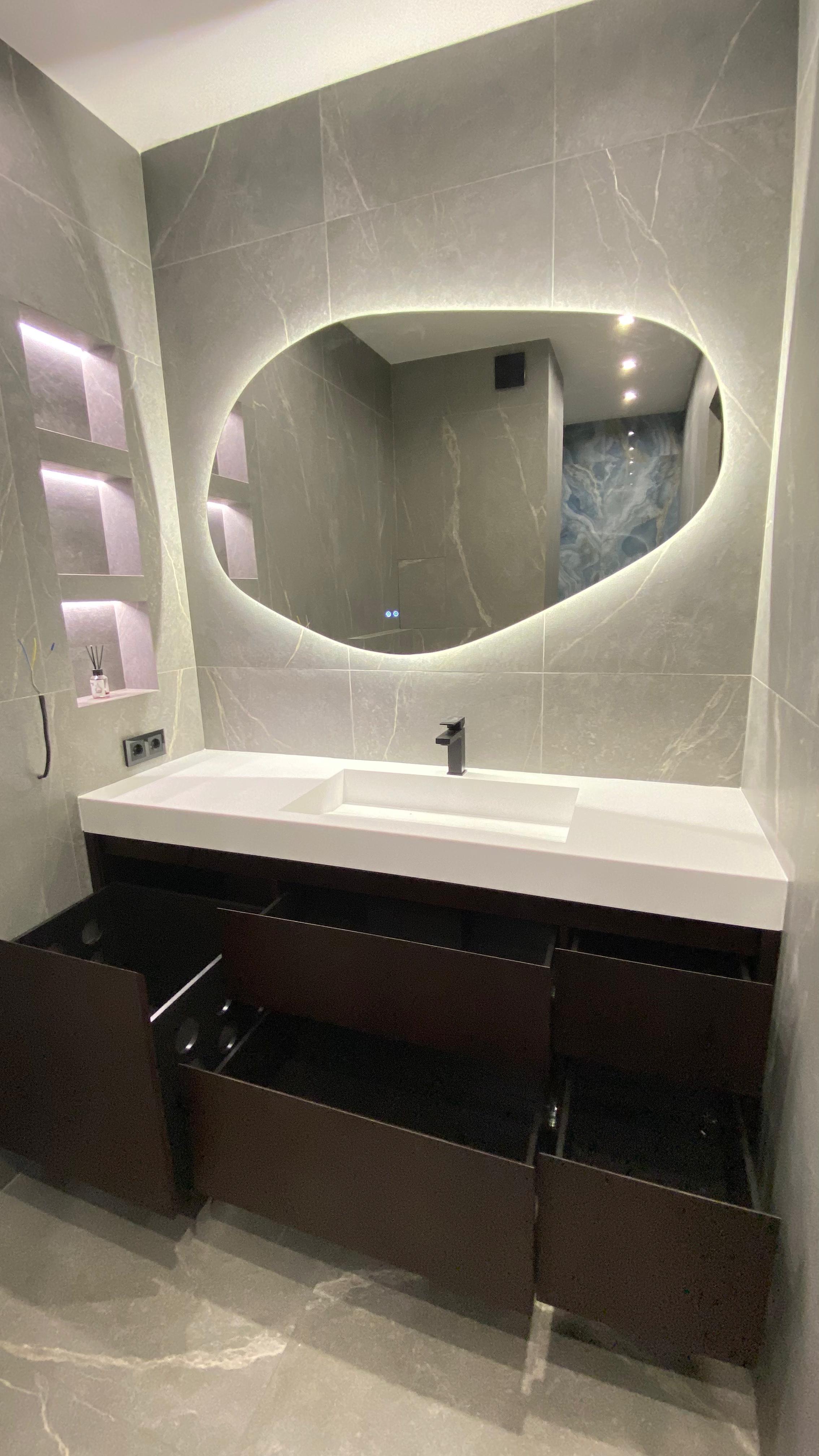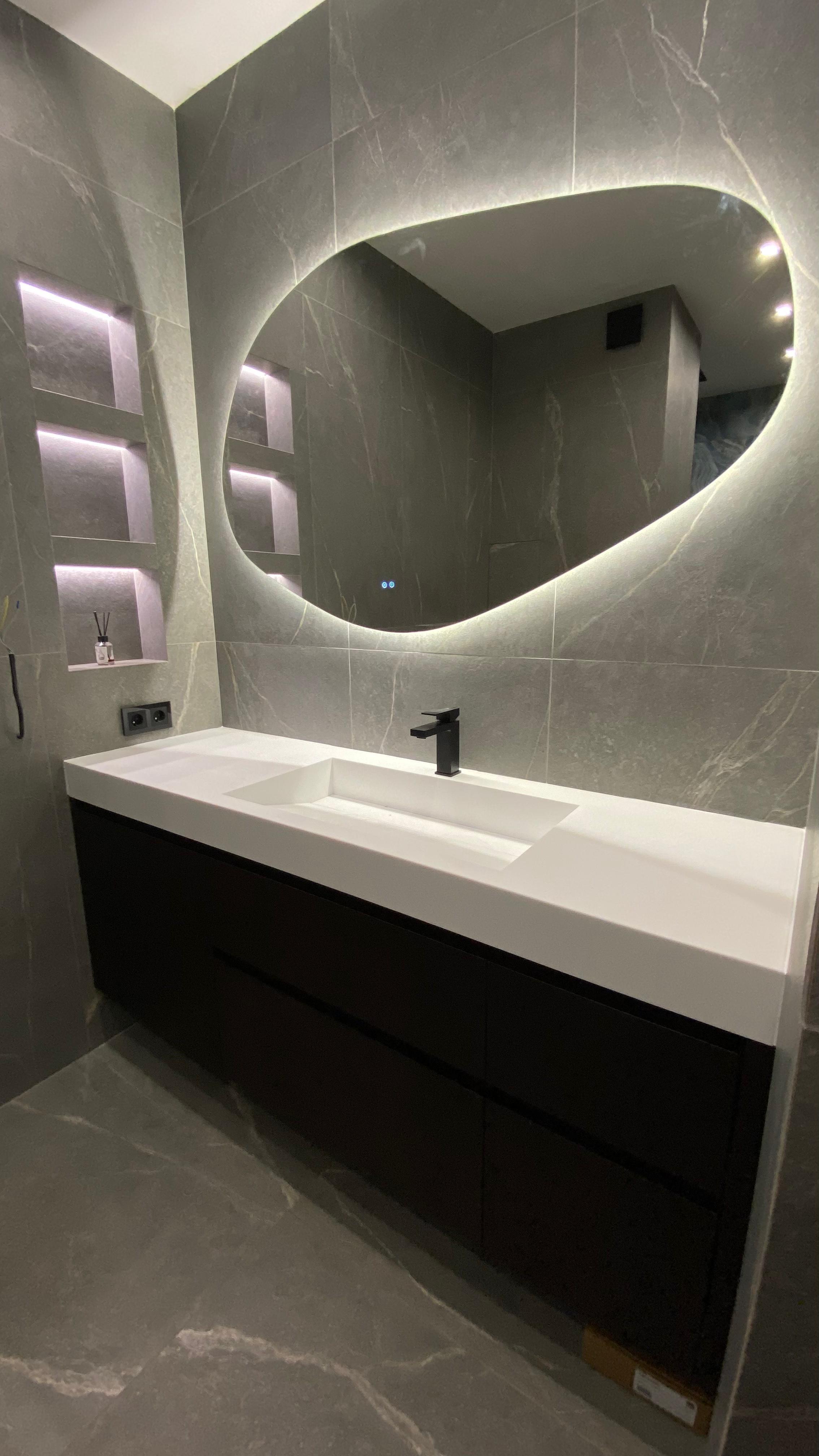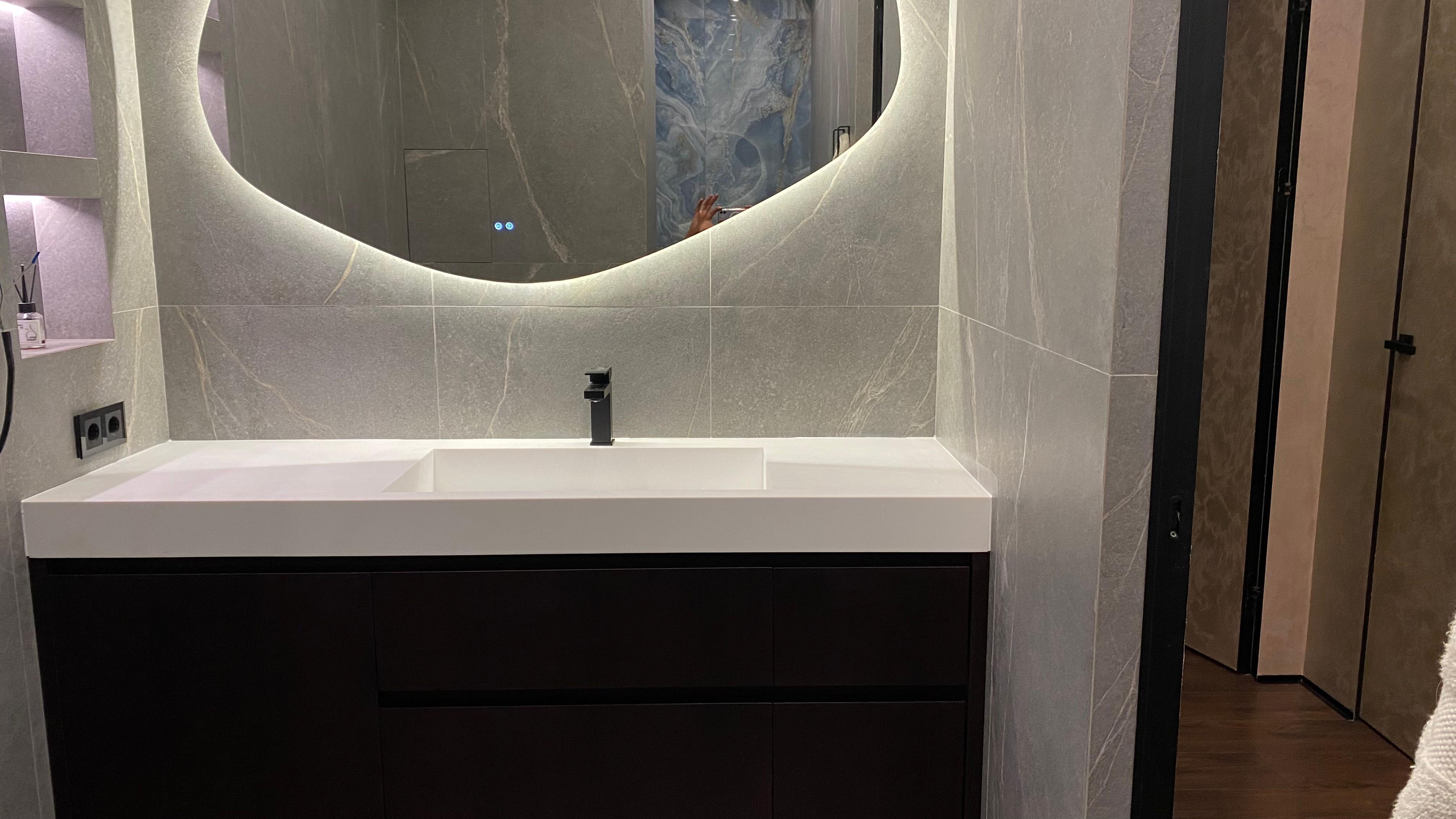 Реализованный проект в ЖК Заречье Парк. *Столешница и раковина* Столешница и раковина представляют собой единое целое, выполненное из искусственного камня акрилового камня . Поверхность матовая с легким полуматовым блеском. * *Форма и конструкция:* Это интегрированная (встроенная) раковина. Ее чаша не выпирает над поверхностью столешницы, а врезана в нее, создавая бесшовный и элегантный переход. Форма раковины — прямоугольная с закругленными углами. * *Контраст:* Белая столешница резко контрастирует с темной тумбой, что является ключевым элементом дизайна и делает раковину центральным акцентом. Зеркало имеет уникальную, нестандартную форму — овальную или каплевидную, с плавными, изогнутыми краями. Оно выглядит очень современно и художественно. * *Подсветка:* Самая заметная особенность — это яркая светодиодная подсветка, расположенная по всему периметру зеркала. Подсветка создает эффект "светящегося" зеркала, мягко освещает лицо пользователя и служит основным источником света для рабочей зоны. *Функциональность:* В отражении зеркала можно увидеть два маленьких синих светодиода — это индикаторы работы встроенных функций, таких как антизапотевание и сенсорное управление. Тумба — это функциональный и элегантный элемент интерьера, выполненный из качественного МДФ с натуральным шпоном венге. Ее матовый темный цвет, отсутствие ручек и модульная конструкция идеально вписываются в современный дизайн ванной комнаты, создавая ощущение роскоши и порядка. *Общий вывод:* Эта комбинация — темная матовая тумба, белая интегрированная столешница-раковина и крупное зеркало с подсветкой — создает очень современный, роскошный и функциональный интерьер. Все элементы гармонично сочетаются по форме, цвету и стилю, формируя единую композицию.