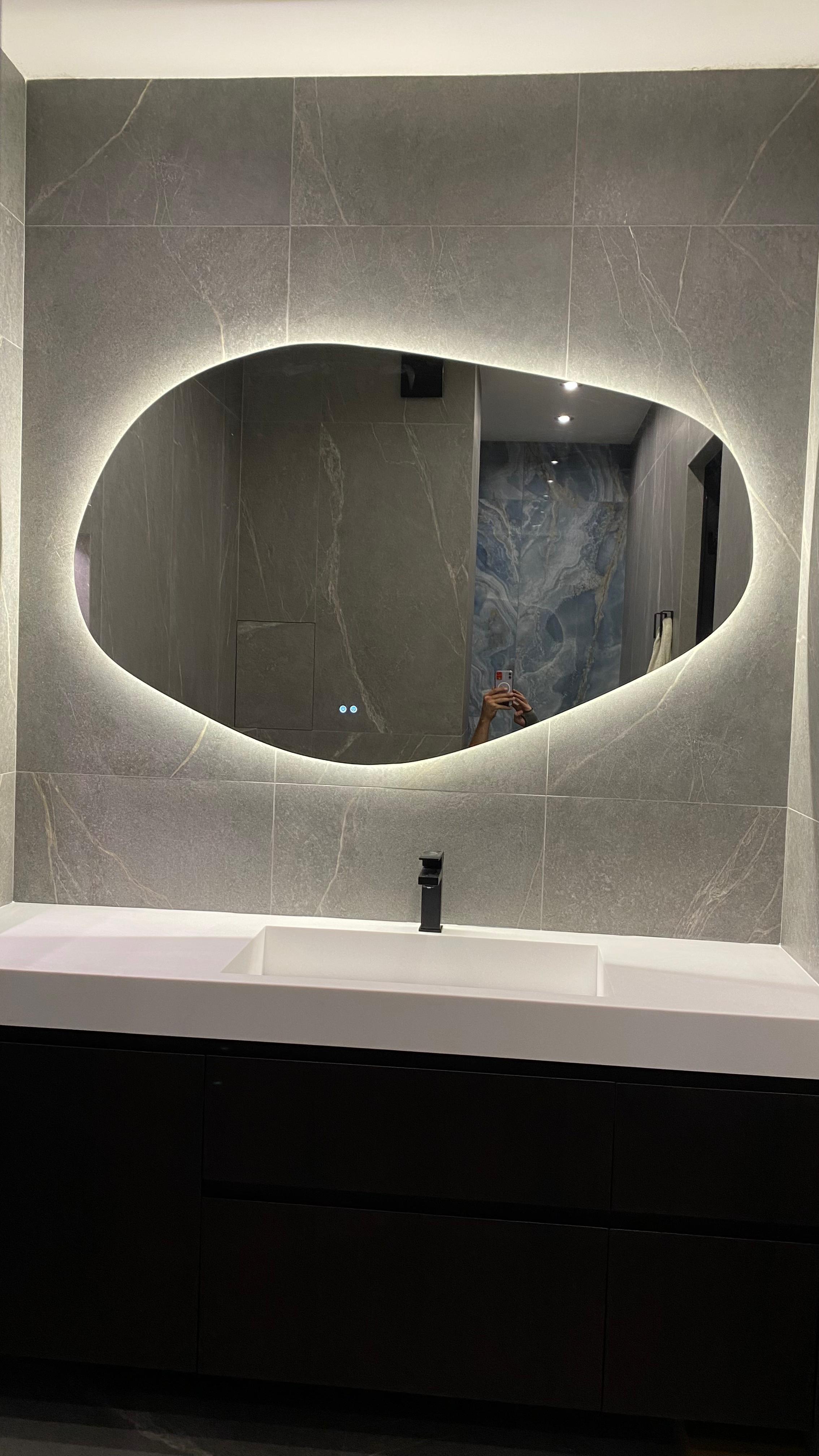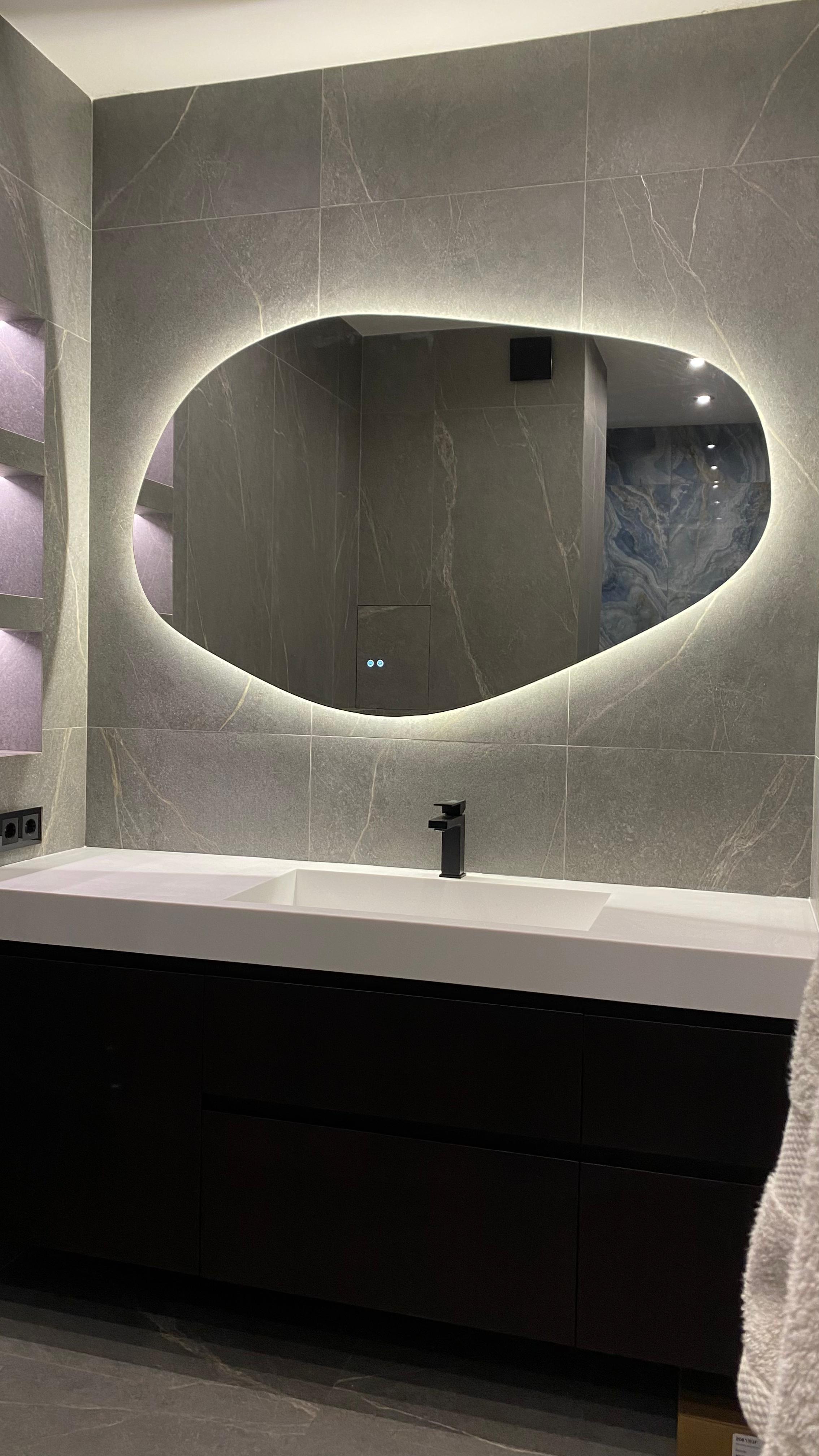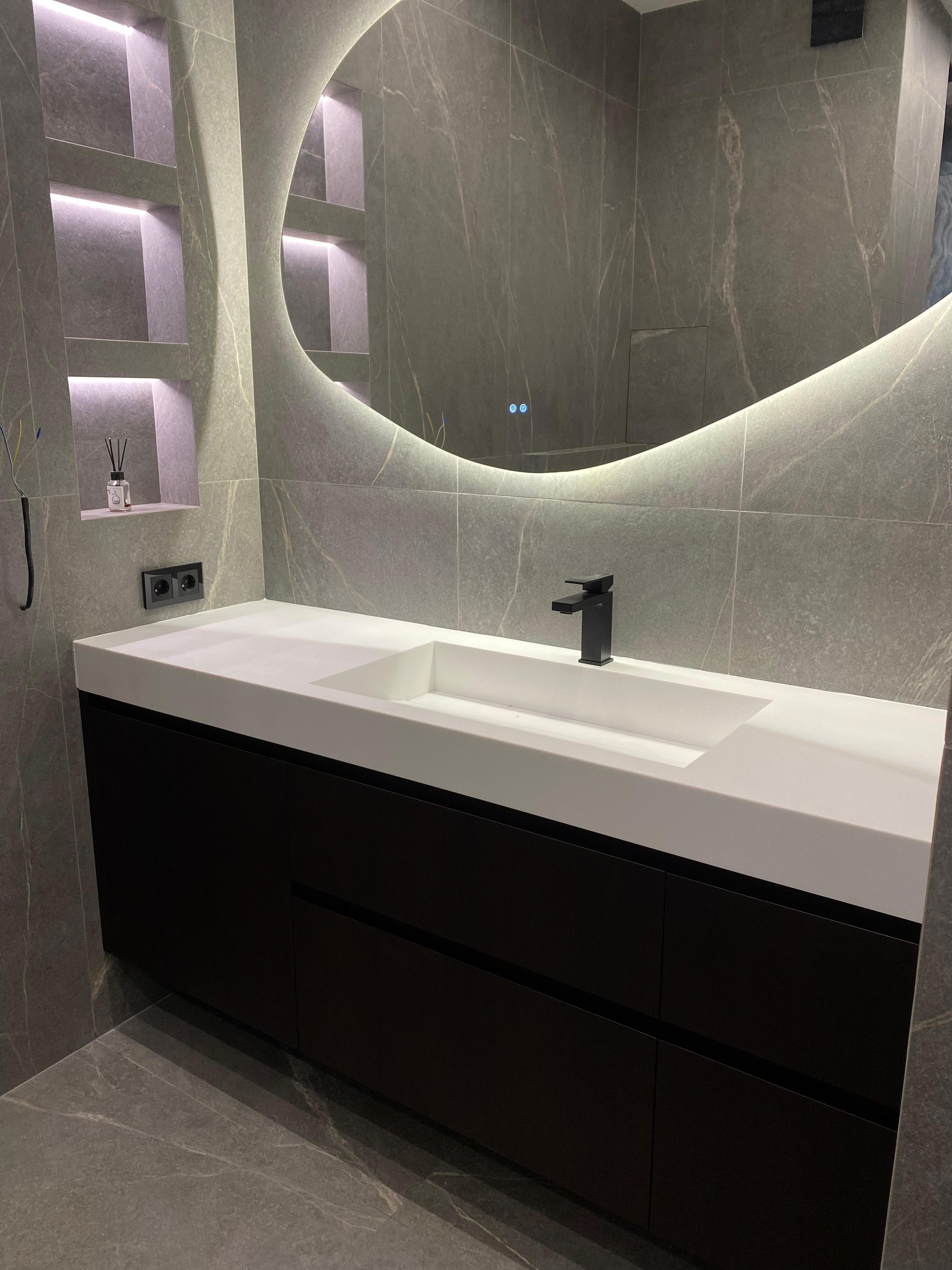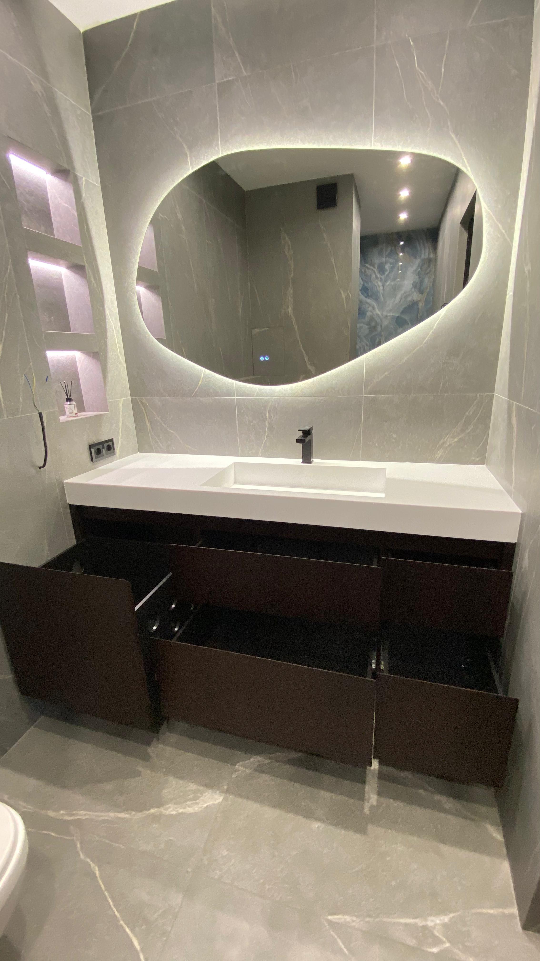 Реализованный проект в ЖК Заречье Парк. *Столешница и раковина* Столешница и раковина представляют собой единое целое, выполненное из искусственного камня акрилового камня . Поверхность матовая с легким полуматовым блеском. * *Форма и конструкция:* Это интегрированная (встроенная) раковина. Ее чаша не выпирает над поверхностью столешницы, а врезана в нее, создавая бесшовный и элегантный переход. Форма раковины — прямоугольная с закругленными углами. * *Контраст:* Белая столешница резко контрастирует с темной тумбой, что является ключевым элементом дизайна и делает раковину центральным акцентом. Зеркало имеет уникальную, нестандартную форму — овальную или каплевидную, с плавными, изогнутыми краями. Оно выглядит очень современно и художественно. * *Подсветка:* Самая заметная особенность — это яркая светодиодная подсветка, расположенная по всему периметру зеркала. Подсветка создает эффект "светящегося" зеркала, мягко освещает лицо пользователя и служит основным источником света для рабочей зоны. *Функциональность:* В отражении зеркала можно увидеть два маленьких синих светодиода — это индикаторы работы встроенных функций, таких как антизапотевание и сенсорное управление. Тумба — это функциональный и элегантный элемент интерьера, выполненный из качественного МДФ с натуральным шпоном венге. Ее матовый темный цвет, отсутствие ручек и модульная конструкция идеально вписываются в современный дизайн ванной комнаты, создавая ощущение роскоши и порядка. *Общий вывод:* Эта комбинация — темная матовая тумба, белая интегрированная столешница-раковина и крупное зеркало с подсветкой — создает очень современный, роскошный и функциональный интерьер. Все элементы гармонично сочетаются по форме, цвету и стилю, формируя единую композицию.