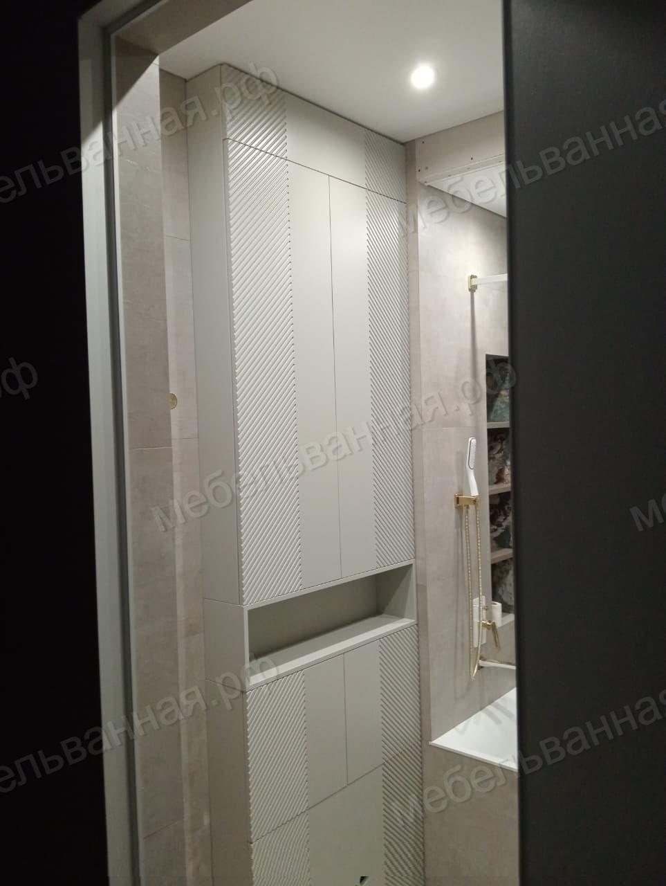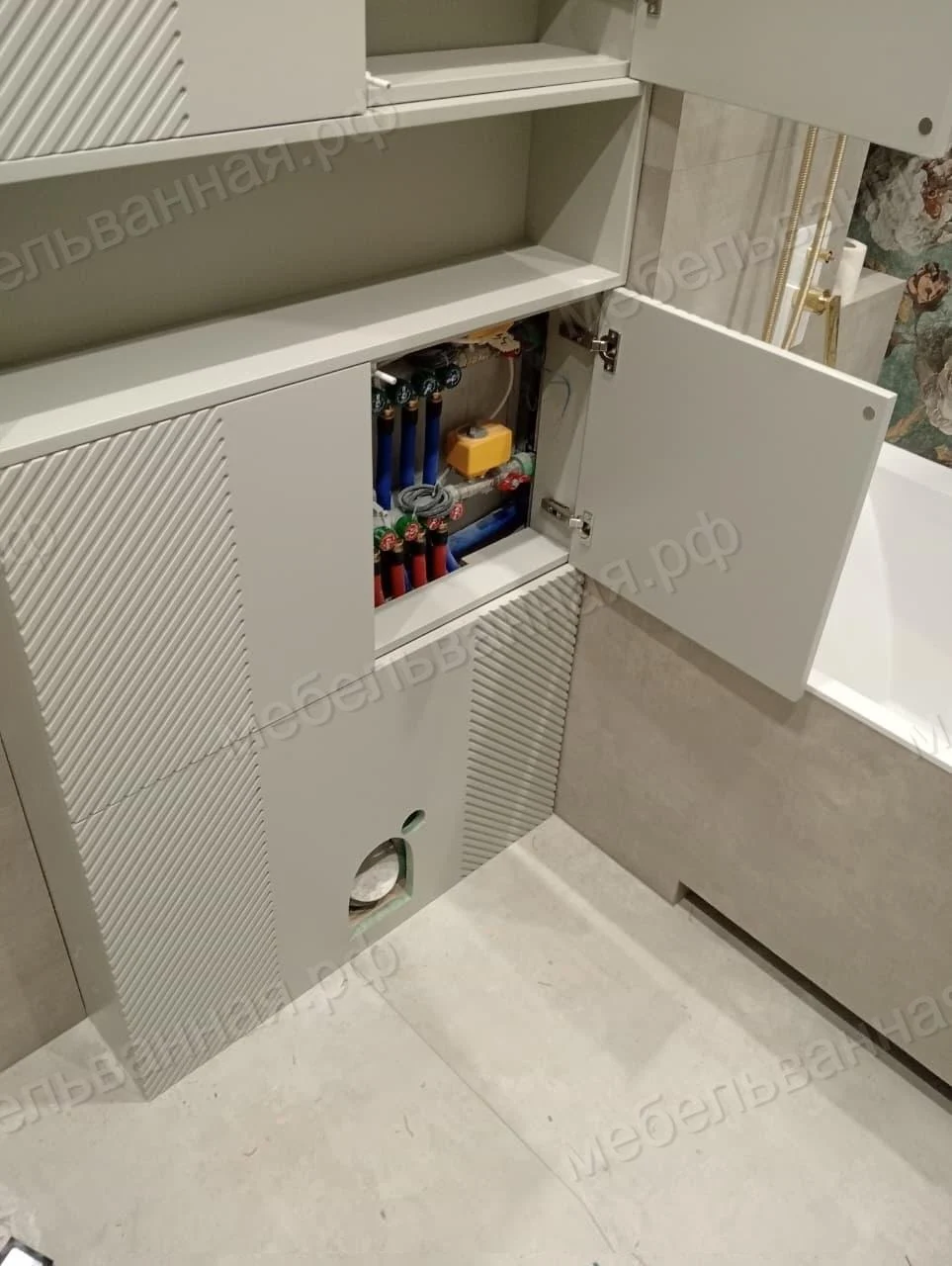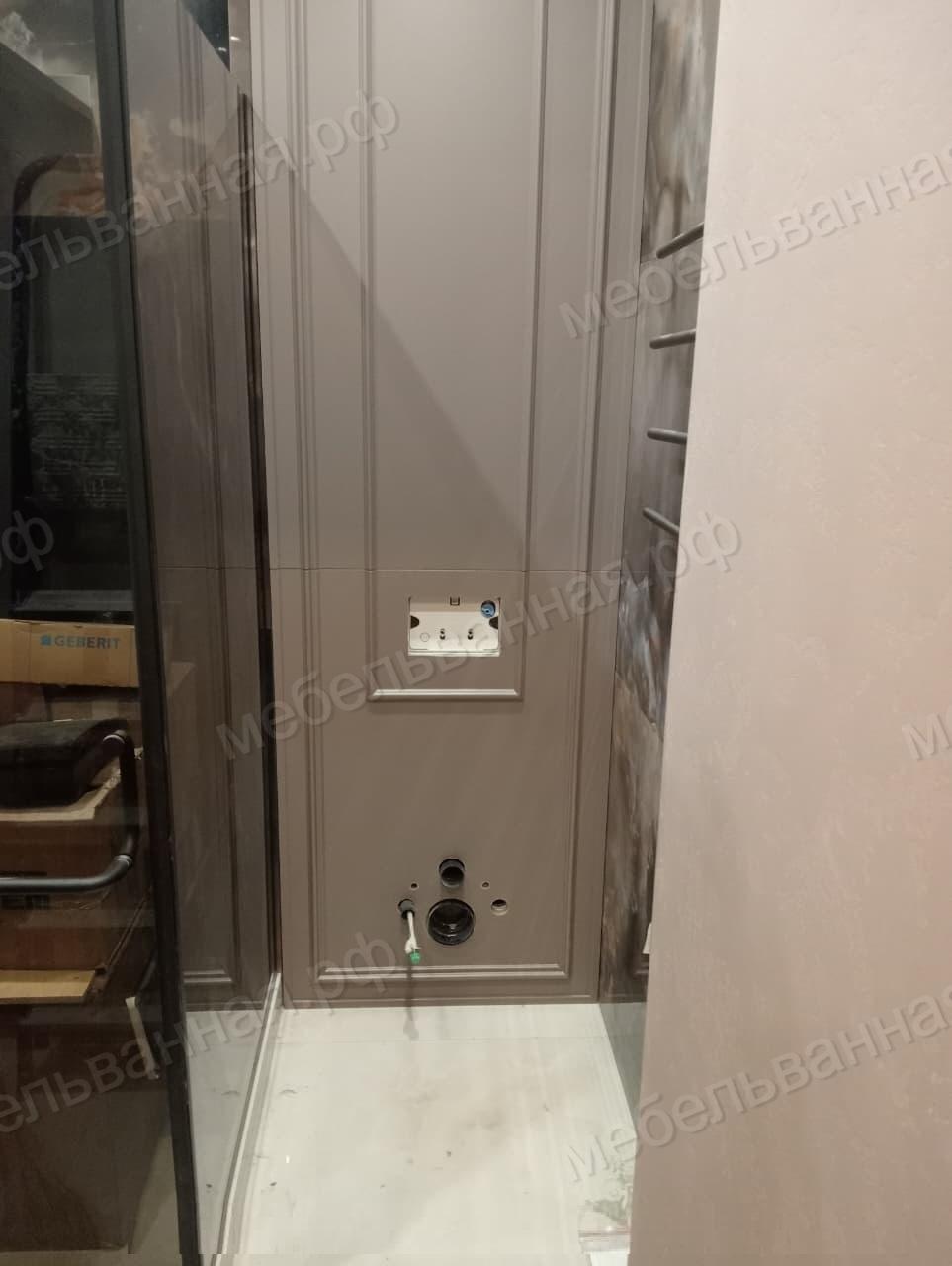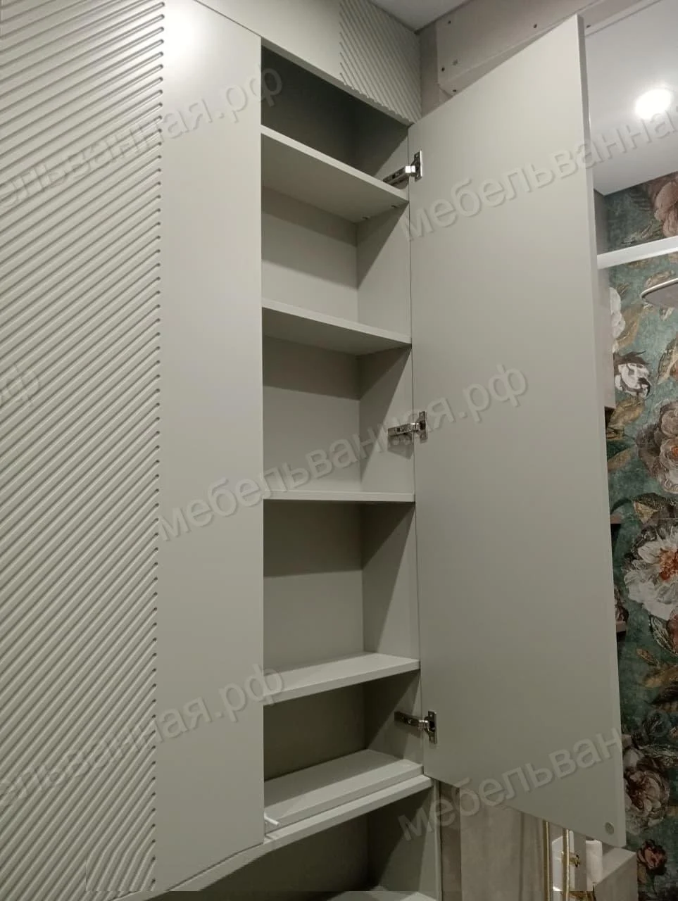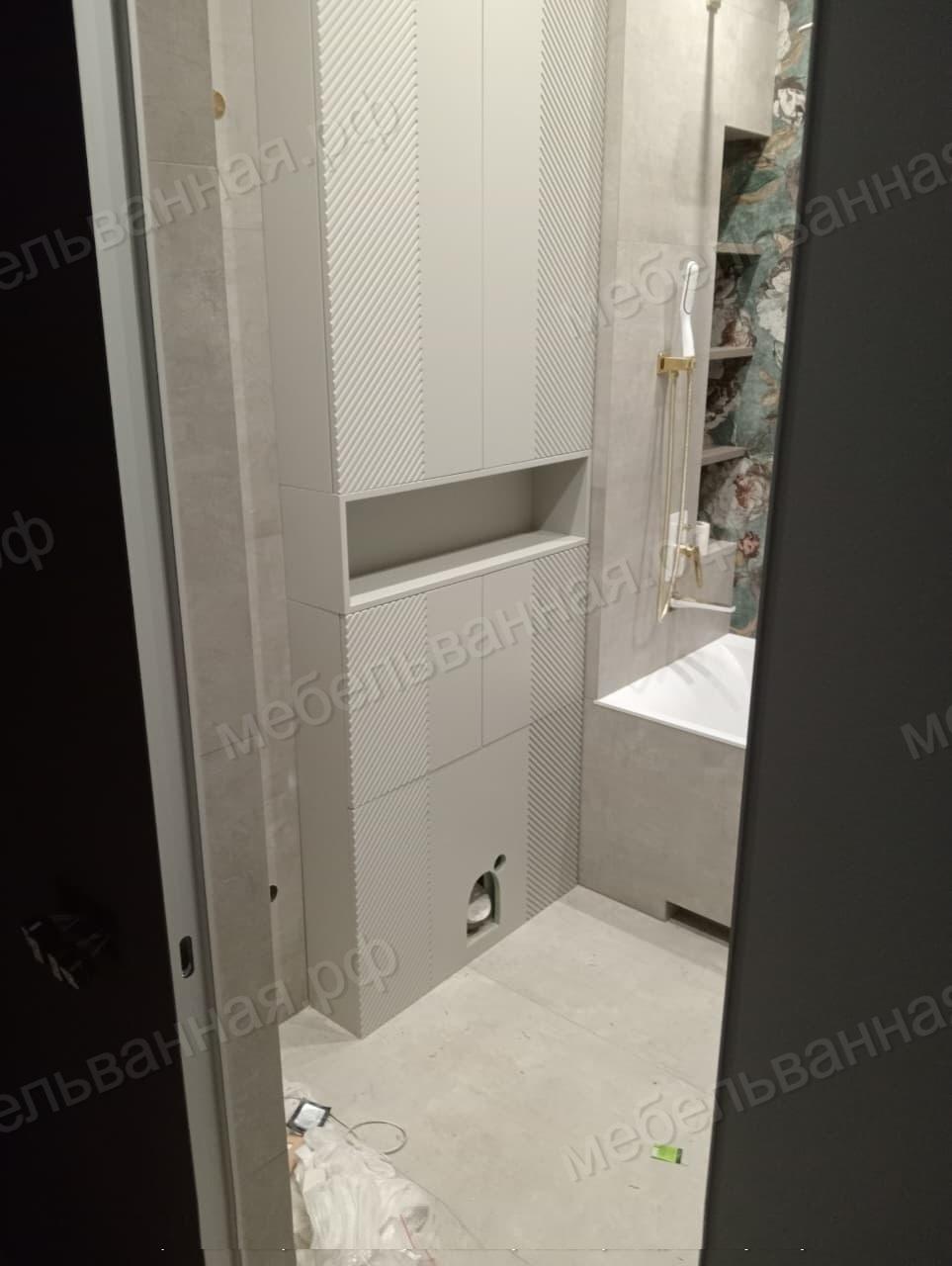 Шкаф над инсталляцией в ванной с открытой нишей. Вы можете выбрать наполнение мебели, размер, конструктив. Ручки (накладные, скрытые, без ручек - система открывания Tip-On). Количество ящиков - от 1 шт . Фурнитура - Boyard, Blum, Hettich. Мы изготовим необходимую Вам мебель по индивидуальному размеру и дизайну, с любым функционалом. Более 9000 цветовых решений по RAL или NCS палитре. Широкий выбор материалов - МДФ в эмали, МДФ в плёнке, AGT, EGGER, SMART, CLEAF. Выбор фурнитуры от средних до премиальных брендов. Для получения консультации Вы можете: - написать на электронную почту:ldstudio25@bk.ru позвонить нам :+7 (905) 528-42-50
